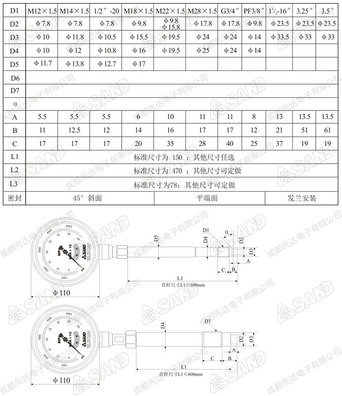 5.机械连接:提供常规 1/2"-20UNF、M14×1.5、M22×1.5、非常规 M18×1.5、G3/4"等螺纹安装尺寸可选;