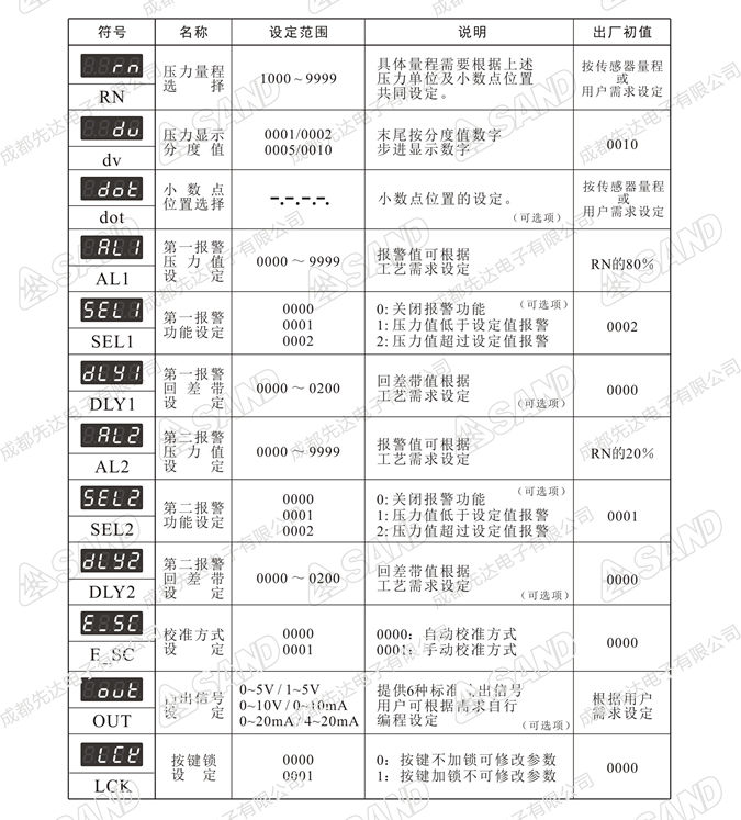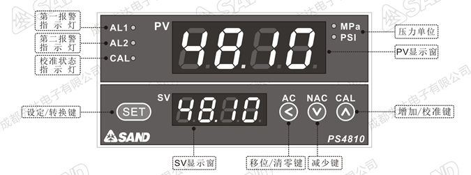 1. 双层四位高亮红色、绿色LED数码管显示实际压力值和设定值;