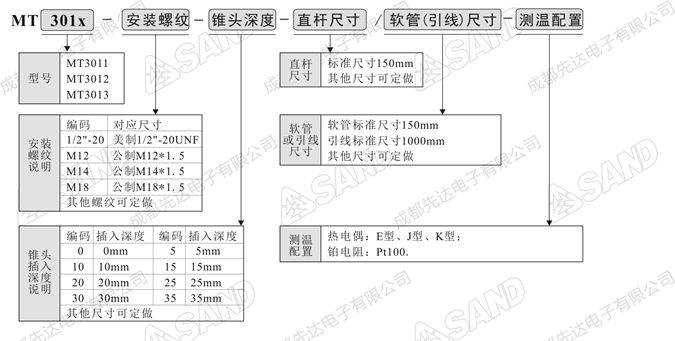 5.保护管材料:奥氏体不锈钢304,316L或指定材料;MT301x系列熔体温度传感器-规格型号即订货格式说明: